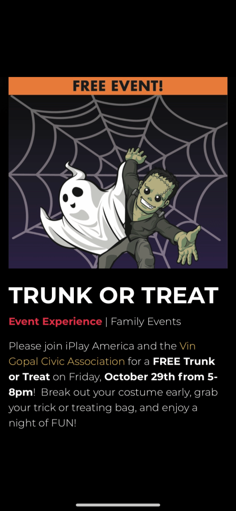 Please join iPlay America and the Vin Gopal Civic Association for a FREE Trunk or Treat on Friday, October 29th from 5-8pm! Break out your costume early, grab your trick or treating bag, and enjoy a night of FUN!