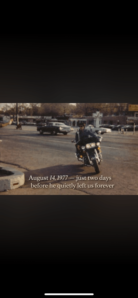 The image shows him moving through the city, alone with his thoughts. There is no performance, no spotlight, only the road ahead and memories behind him. No one who saw him that day could have known how little time remained. To passersby, it was simply Elvis on his motorcycle. To history, it would become one of the final glimpses of him still living, still moving, still holding on.